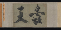 When the scroll is opened we find a blue paper with a Chinese calligraphic writing composed of two characters, the first of which is pot, and the second is heaven.